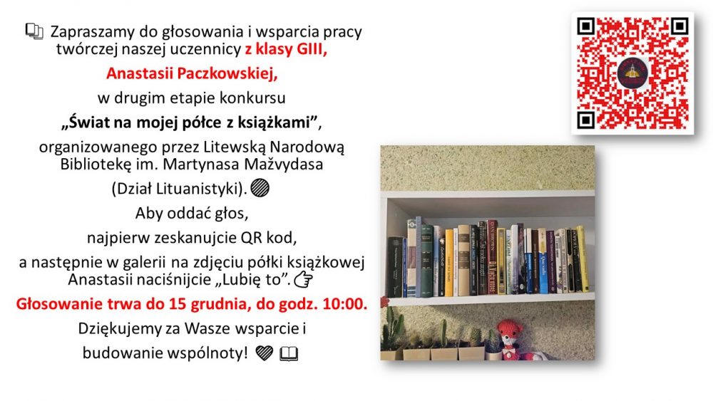 Wielkie brawa kierujemy do uczennic Moniki z GIIIa, Agnieszki z GIIIa, Modesty z GIIb, Aurėji z 8b, Gabrieli z 8b, Emilii z 8c oraz Oliwii z 5a, które wykazały się kreatywnością i sercem podczas tworzenia ozdób. Dzięki Wam nasza choinka zachwyciła odwiedzających!