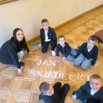 Dzieci układały puzzle przedstawiające portret patrona oraz wejście do naszej szkoły – dzięki temu mogły połączyć symbolikę miejsca z osobą Jana Śniadeckiego.