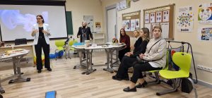Gimnazijos pedagogų komanda (Asta Goberienė, Virginija Levanauskaitė, Asta Račkauskienė, Audronė Armonienė, Rasa Lakickienė) dalijosi STEAM ir CLIL metodikos taikymo patirtimis, o socialinės pedagogės Gintarė Orintienė, Jolita Trapulionienė bei psichologė Laura Kuncevičienė pristatė įtraukties ir adaptacijos atvejus bei gabių mokinių ugdymo iššūkius.