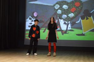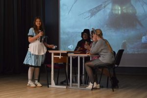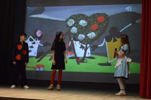 Uczniowie klasy 7b, jak co roku, zorganizowali przedstawienie dla uczniów naszej szkoły. W tym roku zespół wystawił trzy spektakle dla różnych grup wiekowych. „Alicja w Krainie Czarów” okazała się niezapomniana, podobnie jak „Kopciuszek” w ubiegłym roku. Muzyka, kostiumy i gra aktorska stały na bardzo wysokim poziomie. Spektakl został w całości przygotowany i zaprezentowany w języku angielskim, co było dodatkowym atutem i dowodem na wysoki poziom umiejętności językowych uczniów.